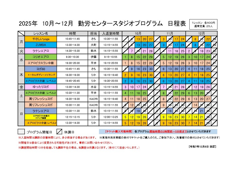 2025年度「東海市立勤労センター スタジオプログラム」10月~12月の日程表を修正しました。(2025年12月6日更新)