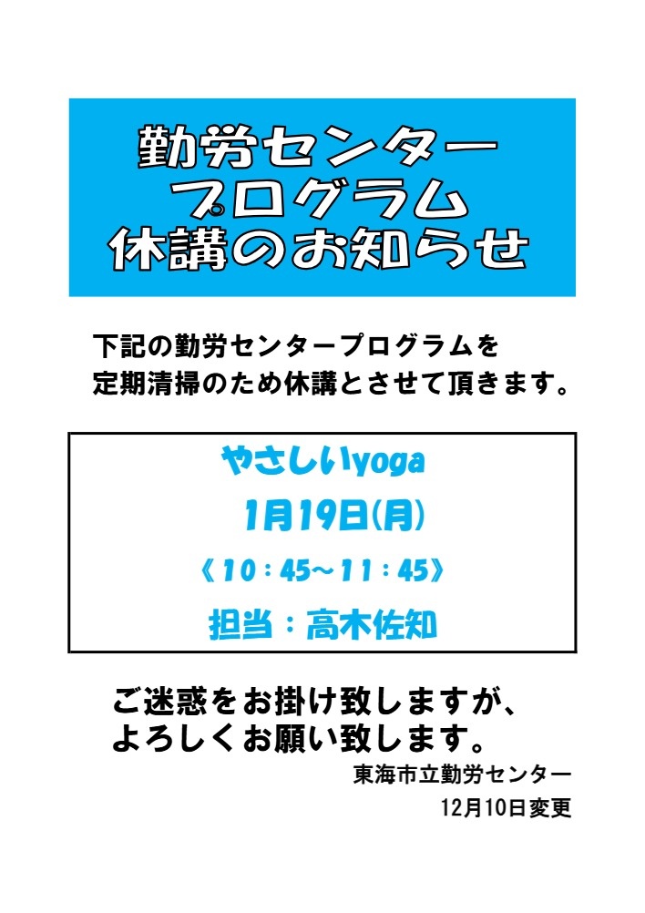 2025年度「東海市立勤労センター スタジオプログラム」休講のお知らせを公開しました。(2025年12月10日更新)