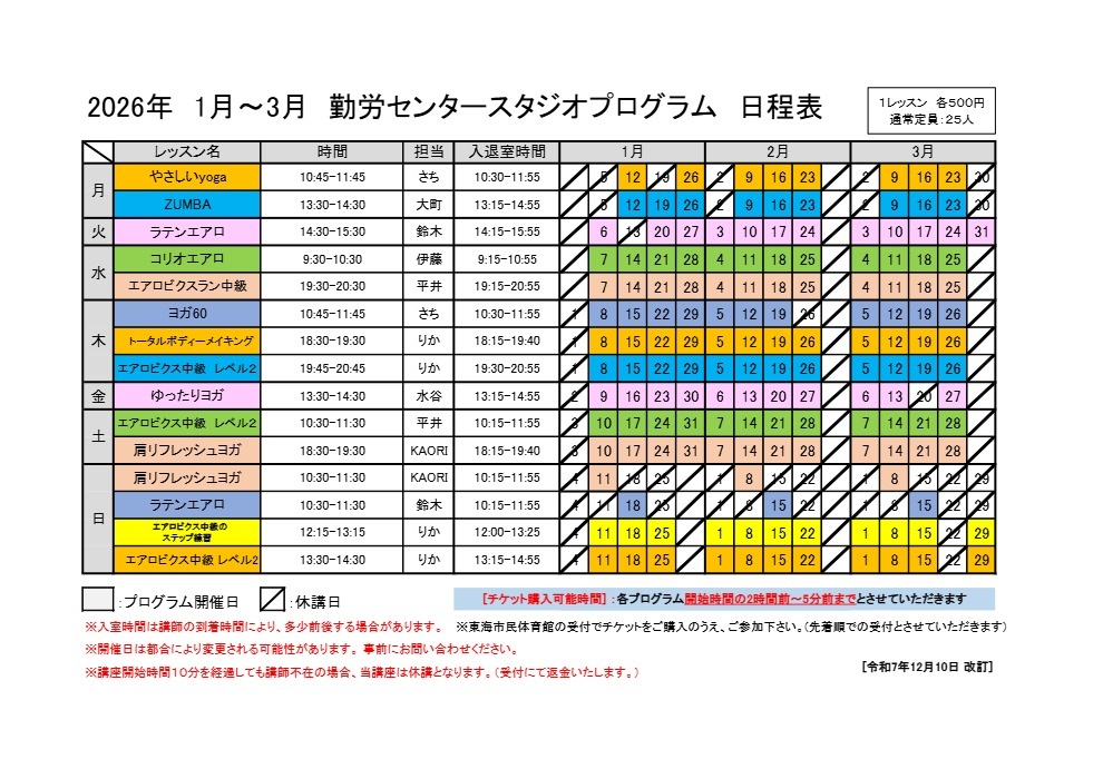 2025年度「東海市立勤労センター スタジオプログラム」1月~3月の日程表を修正しました。(2025年12月10日更新)